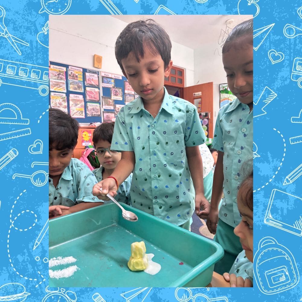 Colours are the realm of magic in nature. Endearing to the spectrum of bright colours, our overjoyed children took the edge off, by showing their artistic skills into a spiral painting activity and displayed a series of images representing the moments of the story they saw. The ultimate unison of creativity was portrayed when they painted their canvasses with their tiny fingers and it turned out to be a masterpiece.
